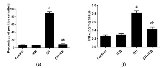 To evaluate the effect of IRB on the inflammatory pathway, the level of the uterine expression of the pro-inflammatory cytokine TNFα was evaluated. There was grade 1 (≤25% stained cells) TNFα expression in control, IRB, and EH+IRB groups (Figure 2a,b,d). On the other hand, the EH group showed grade 4 (>75% stained cells) TNFα expression (Figure 2c). Semiquantitative densitometrical analysis of uterine sections showed that TNFα expression was significantly higher in the EH group compared to the control group and significantly lower in the EH+IRB group compared to the EH group (Figure 2e). The same pattern was seen with the TNFα level measured with ELISA kit (Figure 2f).