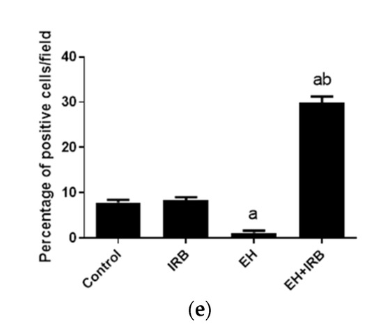 Negative cleaved caspase 3 expression was observed in control, IRB, and EH groups (Figure 4a–c). Meanwhile, the EH+IRB group showed positive cleaved caspase 3 expression (Figure 4d). Semiquantitative densitometrical analysis showed that cleaved caspase 3 expression was significantly higher in the EH+IRB group compared to control and EH groups (Figure 4e).