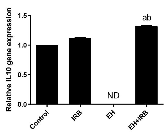 Figure 5. Uterine interleukin-10 (IL10) relative gene expression detected by real-time polymerase chain reaction. Values represent the mean ± SEM (n = 6). a,b Significantly different (p < 0.05) from control and EH groups, respectively. IRB: irbesartan; ND: non-detected.