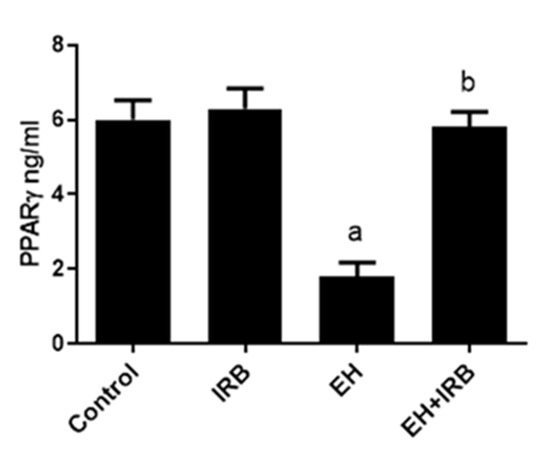 Figure 6. Effect of irbesartan (IRB) on peroxisome proliferator-activated receptor gamma (PPARγ) in estradiol benzoate-induced endometrial hyperplasia (EH) and atypia in rats. Values are mean ± SEM (n = 6–7). a,b Significantly different (p < 0.05) from control and EH groups, respectively.