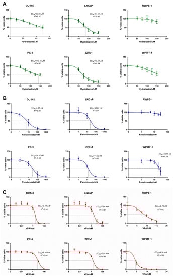 Dose–response curves. Cell viability measured by resazurin in DU145, PC-3, LNCaP, 22Rv1, RWPE-1 and WPMY-1 exposed to hydralazine (A), panobinostat (B) and valproic acid (C) at day 3. Experiments were performed in triplicates of three biological replicates (n = 3), normalized to the respective vehicle and to day 0. EC50 values at day 3 are indicated in each graph.