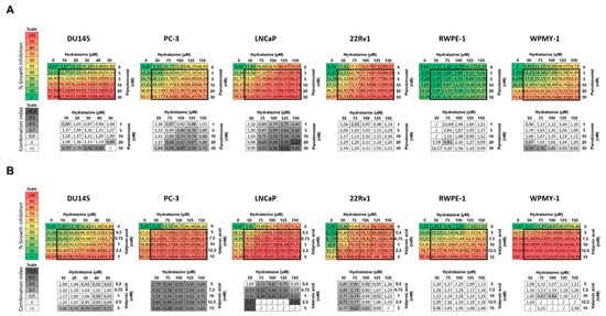 Combination matrix. Cells treated with hydralazine and panobinostat (A) or valproic acid (B) at the indicated concentrations for three days. Each plate contained 6 × 6 dose matrix blocks with several concentrations of both drugs. Percentage of growth inhibition was calculated for each epidrug combination using resazurin and are representative of three biological replicates (n = 3). The combination index (CI) was calculated using CompuSyn software, where <1 indicates synergism, =1 is additive effect and >1 indicates antagonism. The percentage and color codes for growth inhibition and CI scales are shown on the left. The results that CompuSyn could not convert into CI, since the effect values were not between 0 and 1, are represented by /.