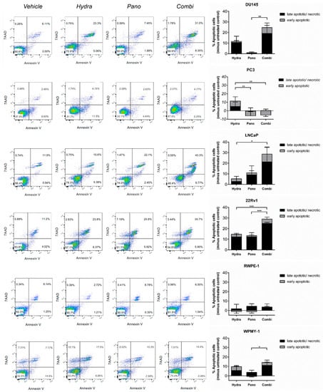 To assess if the previously observed growth inhibition was due to apoptosis induction, the percentage of apoptotic and necrotic cells were assessed in PCa cell lines treated with hydralazine and panobinostat, alone or in combination. The combined treatment led to an increased percentage of apoptotic/necrotic cells compared with each individual treatment alone (Figure 3). Contrarily, PC-3 did not respond to either treatment modality. As expected, no effect was apparent in the non-malignant cell lines. The effect of treatment with hydralazine, panobinostat and the combination approach on the number of viable cells at day 3 is visible in Figure S1A.