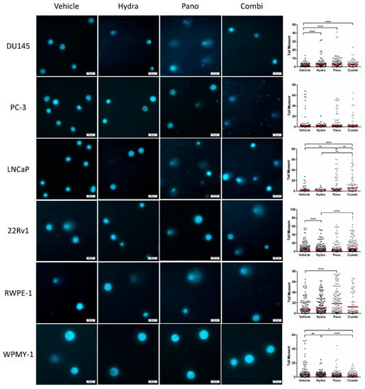 As both hydralazine and panobinostat per se have been linked to DNA damage, the effect of combined treatment on DNA damage was also evaluated using the alkaline comet assay. Remarkably, global DNA fragmentation was significantly higher after the combined treatment in LNCaP compared with each single treatment alone, whereas in 22Rv1, differences were only apparent for the condition with hydralazine alone (Figure 4). Surprisingly, though both hydralazine and panobinostat increased DNA damage individually, their combination did not result in additional DNA fragmentation in DU145 cells. In accordance with apoptosis results, both treatment modalities did not increase DNA damage in PC-3 and WPMY-1 cells. Nevertheless, panobinostat significantly increased tail moment in RWPE-1 cells.