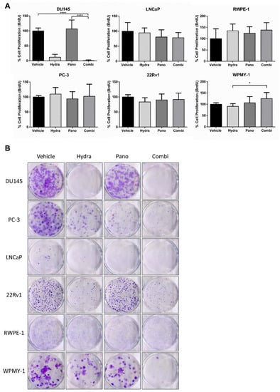 Effect of combined epidrug treatment on cell proliferation and colony formation. (A) The percentage of cell proliferation was determined by BrdU assay at day 3 of treatment with hydralazine and/or panobinostat. Experiments were performed in triplicates (n = 3), normalized to the respective vehicle and to day 0. Mean values ± SD are shown, analyzed by Kruskal–Wallis with Dunn’s test for multiple comparisons. (B) Representative images of the colony formation assay performed in prostate cell lines exposed to hydralazine and/or panobinostat for 3 days. Colony formation was followed for 7 additional days (10 days for LNCaP). Experiments were carried out in triplicates (n = 3). The effect was compared with the vehicle condition. Drug concentrations: DU145–Hydra: 50 µM, Pano: 5 nM; PC-3, RWPE-1 and WPMY-1–Hydra: 100 µM, Pano: 10 nM; LNCaP–Hydra: 100 µM, Pano: 5 nM; 22Rv1–Hydra: 75 µM, Pano: 1 nM). * p < 0.05; **** p < 0.0001.