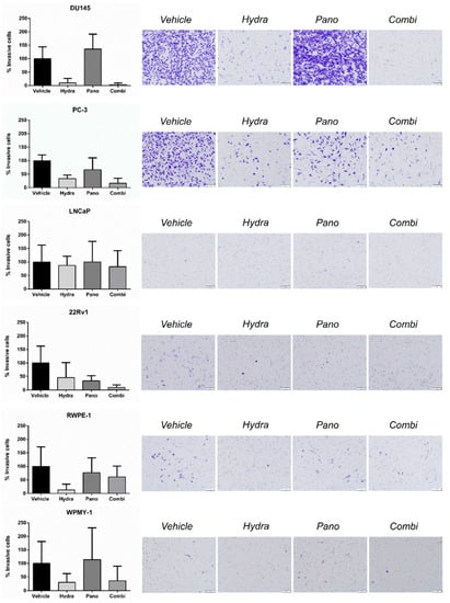 In parallel, the effect of the epidrugs in PCa cell lines’ invasive capabilities was tested using an invasion transwell assay. Twenty-four hours after seeding, the vehicle-treated cell lines with the highest percentage of invasive cells were DU145 and PC-3, whereas for LNCaP and 22Rv1 this percentage was only marginal (below 0.3%) (Figure 6). Nevertheless, 22Rv1 cells’ invasion reduction upon treatment with each epidrug individually was further enhanced upon combination. Moreover, DU145 cells’ exposure to hydralazine alone, but not panobinostat, also reduced invasion, the effect of combined treatment being only slightly superior to hydralazine’s effect. Likewise, the effect of hydralazine upon PC-3 invasive capabilities was two times higher than that of panobinostat, the combined treatment being able to further reduce the percentage of invasive cells. Nevertheless, these differences were not statistically significant (Figure 6).
