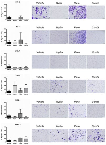 Additionally, the migration capabilities of PCa cell lines were evaluated through a migration transwell assay. In accordance with the invasion assay, but to a lesser extent, the vehicle-treated DU145 cells displayed the highest percentage of migratory cells compared with the other cell lines. Furthermore, DU145 cells’ exposure to hydralazine alone or in combination, but not to panobinostat alone, reduced cell migration (Figure 7). However, the percentage of migratory cells for the remainder of the untreated PCa cell lines was quite low (below 0.5%). Nonetheless, no significant differences were observed between the different treatment modalities (Figure 7).