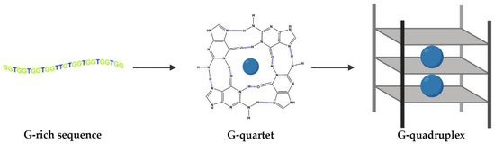 DNA and RNA sequences can adopt different conformations, such as duplexes, hairpins and, when they are rich in the guanine (G) nucleobase, they can also fold into G-quadruplex (G4) structures [1]. The building blocks of G4s are G-quartets that are formed through a cyclic Hoogsten hydrogen-bonding arrangement of four guanines with each other. The planar G-quartets stack on top of one another forming four-stranded helical structures. G4 formation is driven by monovalent cations such as Na+ and K+, and hence physiological buffer conditions favor their formation (Figure 1) [1]. G4 structures present several topologies depending on the cation, strand stoichiometry (intramolecular or intermolecular), polarity, orientation (parallel, antiparallel or hybrid) and loop size (edge-wise, diagonal, double chain-reversal or propeller and V-shaped) [2,3,4].