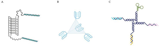 (A) AS1411 as a targeting agent in a multifunctional aptamer-based system in which a double stranded (5′-GC-3′ or 3′-GC-5′ base pairs) is used to deliver the doxorubicin [39]. (B) DNA tetrahedra structures (DTNs), formed with four molecules of AS1411 bound [40]. (C) 4-arm DNA/RNA construct, with one of the arms presenting the AS1411 and the remaining constituted by different siRNA strands (anti-AKT, anti-MDM2 and anti-Survivin) [41].