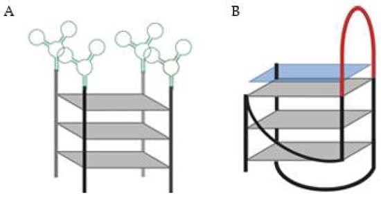 (A) DNA aptamer specific for Protein Tyrosine Kinase (PTK)7 (green) linked to 15 consecutive guanines, the AptG15 [56]. (B) G4-based drug delivery carriers (GDDC) loaded with an anionic copper(II) phthalocyanine (blue square).The GDDC presents a loop (red), which can hybridize with epidermal growth factor receptor mRNA [57].