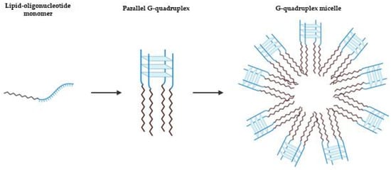 Schematic representation of lipid-driven assembly of tetramolecular parallel G4s. Depending on the nature of the lipid, the sequence of oligonucleotide and of salts present, the tetramolecular parallel G4 can result in micellar assemblies [82].