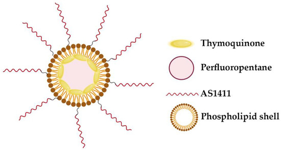 Schematic of AS1411-conjugated nano-droplets loaded with thymoquinone. The perfluorocarbon-based nano-droplet emulsions were coated with a phospholipid shell, formed by DPPC/DSPE-PEG2000 [86].