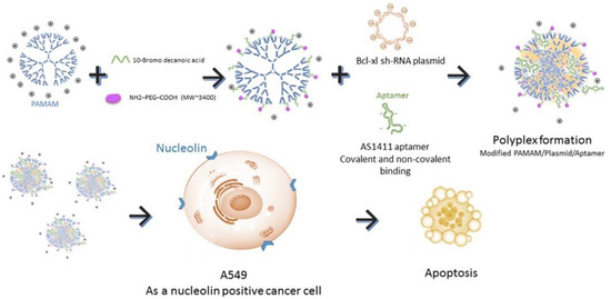 Schematic representation of AS1411-conjugated modified PAMAM dendrimers. These dendrimers efficiently target nucleolin positive cells (A549 cells), knockdown the protein expression of Bcl-xL and induce apoptosis in the target cells. Reprinted from The International Journal of Biochemistry and Cell Biology, 92, Ayatollahi, S.; Salmasi, Z.; Hashemi, M.; Askarian, S.; Oskuee, R.K.; Abnous, K.; Ramezani, M., Aptamer-targeted delivery of Bcl-xL shRNA using alkyl modified PAMAM dendrimers into lung cancer cells, 210–217, Copyright (2017), with permission from Elsevier [91].