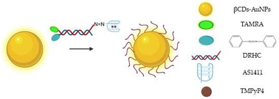 Schematic representation of AS1411-functionalized βCDs-AuNPs, which also contain: hypoxia-induced cleaved azobenzene bridges, DRHC tagged with TAMRA and the photo-sensitizer TMPyP4 [100].