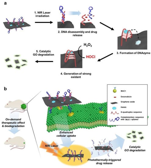 Schematic illustration self-catalytic GO-He-G4-M@DOX nano-system for cancer therapy conducted by a DNAzyme and controlled by photo-switch. (a) Design of GO-He-G4-M@DOX operated by photo-switch. (b) The systemic application of GO-He-G4-M@DOX can result in the controlled anticancer release and, subsequent, biodegradation into fluorescent small fragments of GO. Reprinted from Biomaterials, 263, Lee, H.; Kim, J.; Lee, J.; Park, H.; Park, Y.; Jung, S.; Lim, J.; Choi, H.C.; Kim, W.J., In vivo self-degradable graphene nano-medicine operated by DNAzyme and photo-switch for controlled anticancer therapy, 120402, Copyright (2020), with permission from Elsevier [62].
