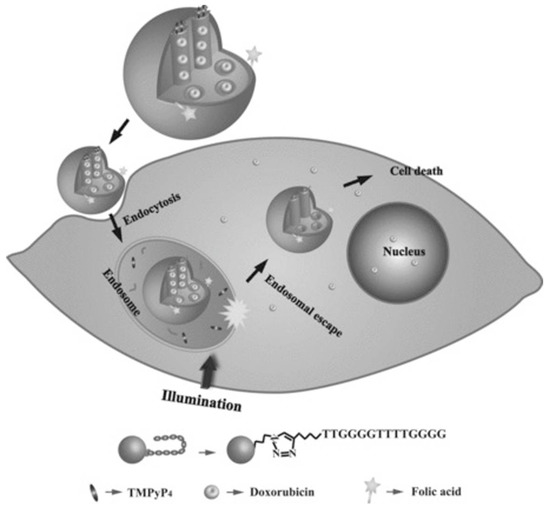 Taking this into account, Chen et al. created a novel nano-system for targeted intracellular drug delivery composed by photo-sensitizer-incorporated G4 DNA-capped mesoporous silica nano-particles [63]. Since this system is composed by a photo-sensitizer (TMPyP4), upon light irradiation, it generates ROS, leading to cleavage of G4 DNA ((G4T4G4)2) capping agent and allowing drug release. Moreover, besides the capping agent function, the G4 DNA also acts as a carrier of TMPyP4 (Figure 12). This nano-system is a synergistic combination of chemotherapy and PDT for cancer treatment with spatial and temporal control [63]. Additionally, through the introduction of folic acid, they obtained tumor targeting efficiency [63], since the folate receptor is upregulated in different cancer cells [105], resulting in a specific internalization of the nano-system by the cancer cell line and localize the endolysosomal compartment [63]. The authors also suggest that the light excitation might induced endosomal membrane damage mediated by ROS produced by the TMPyP4 [63]. Additionally, to test the anticancer drug delivery, this nano-system was used to deliver doxorubicin into cancer cells and it was verified that the complete nano-system (composed by the mesoporous silica nano-particles with the G4 DNA, the TMPyP4 and the folic acid loaded with doxorubicin) exposed to light irradiation presented higher cytotoxicity than all tested control situations (except when compared to free doxorubicin, which has a slightly higher toxicity) [63]. This effect was probably caused by the limited illumination time that could be unable to complete uncap the DNA and, thus, incapable to release the doxorubicin from the mesopoporous silica nano-particles, while the free drug can easily diffuse through the cells. However, the authors claimed that this approach could be more efficient to apply in vivo, due to the targeting properties of the folic acid, avoiding nonspecific effects in nonmalignant regions [63].