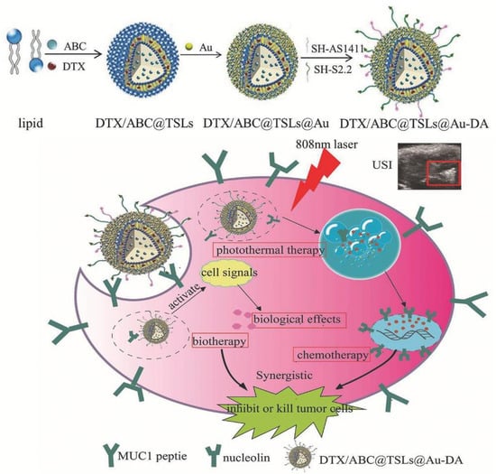 Besides all the above-mentioned nano-particles, there is still some other strategies that result from a mixture of organic and inorganic components. For example, Zhao et al. designed a near-infrared photo-thermal responsive dual aptamers-targeted docetaxel-containing nano-particles (Figure 13) [110]. In this system, docetaxel and NH4HCO3 are loaded in liposomes. However, since local heating is often difficult to achieve in clinical applications, liposomes were coated with gold that produce heat under 808 nm laser irradiation to induce nano-particles’ decomposition [110]. Moreover, through thermal activation, the NH4HCO3 containing thermosensitive liposomes can generate CO2 bubbles and the acidic environment at the tumor region could also promote bubbles generation. The CO2 bubble production can disrupt cell membranes and enhance drug release [110]. The thermosensitive liposomes were then functionalized with NCL and Mucin1 peptide aptamers, the AS1411 G4 and S2.2 sequences, respectively [110]. Both, NCL and Mucin1 peptide, are overexpressed in cancer cells surface, which leads to a higher cancer targeting efficacy, avoiding an inefficient delivery due to receptor saturation. The resulting nano-system presented good biocompatibility and uniform size (diameter about 200 nm) [110]. Moreover, after 808 nm laser irradiation, the drug loaded was successfully released (84% at 4 h) [110]. Relatively to the biological potential, after in vitro and in vivo experiments, the nano-system demonstrated that it can synergistically inhibit tumor growth by combination of chemotherapy, photo-thermal and biological therapy [110]. The dual ligand functionalization increases cellular uptake on breast cancer cell line cells and achieves ultrasound imaging (USI) at tumor site [110]. Overall, the nano-system was demonstrated to be a promising theragnostic system achieved by a combination of different antineoplastic drugs.