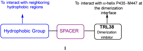 Consequently, we decided to synthesize and test a series of SMPCs of general structure I (Figure 2) in which the bulky nonpolar moieties attached to the N-terminus of TRL38 were meant to interact with hydrophobic regions close to the targeted interfacial α-helix by means of selected spacers of different lengths and physico-chemical properties.