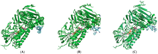 Time evolution of the simulated complex between LiTryR monomer (C atoms in green) and SMPC 4d (C atoms in cyan). The superimposed snapshots correspond to times 5, 25, and 50 ns (A), 75 and 100 ns (B), and 125 and 150 ns (C) of the unrestrained molecular dynamics trajectory in explicit solvent. The FAD cofactor is displayed as sticks with C atoms colored in pink.