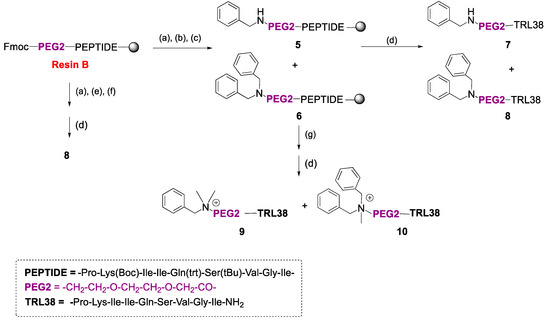 The synthesis of 7 and 8 was performed by solid phase reductive amination [34]. Thus, treatment of Fmoc-PEG2-peptidyl RESIN B (Scheme 2) with DBU and piperidine in DMF, followed by reductive amination reaction with 3.6 equivalents of benzaldehyde and NaCNBH3 (3.6 equivalents), afforded, upon cleavage from the resin (TFA, TIPS, H2O), a mixture of mono- and di-aminoalkylated 7 and 8, in 32% and 9% yield, respectively, after purification. However, the disubstituted SMPC 8 was exclusively obtained in 21% yield when ten equivalents of benzaldehyde and NaCNBH3 were used instead. Finally, treatment of the mixture of 5 and 6 with MeI and 2,6-lutidine provided the quaternized SMPCs 9 and 10 in 25% and 8% yield, respectively, after cleavage and purification. All the compounds synthesized in this work were characterized as trifluoroacetate salts by analytical HPLC and HRMS after purification on a Biotage Isolera or by semi-preparative HPLC.