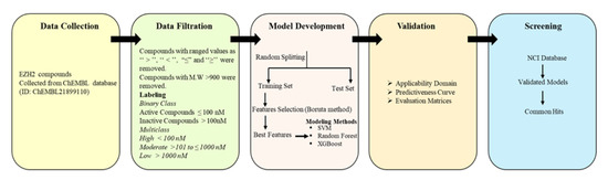 A workflow for the EZH2 modelling process was shown in Figure 1. The EZH2 activity data were collected from the ChEMBL database [51]. Compounds with ranged values such as ‘‘>’’, ‘‘<’’, ‘‘≤’’, and ‘‘≥’’ were removed from the dataset. If a single compound had more than one IC50 value, then the highest of their values was taken into consideration. Compounds with IC50 ≤ 0.1 μM were set as active, whereas compounds with IC50 values > 0.1 μM were set as inactive molecules. In addition to binary class, we also performed multiclass modelling and compounds with IC50 ≤ 0.1μM were labelled as “High”, IC50 > 0.1 μM to IC50 ≤ 1 μM as “Moderate”, and IC50 >1 μM as “Low” affinity. Compounds with >1000 M.W were also removed. A total of ~412 compounds (High activity: 217, Moderate: 88, and Low activity: 107) were selected for predictive model building. Finally, the remaining compounds were randomly divided into training sets and test sets by an 80:20 ratio.
