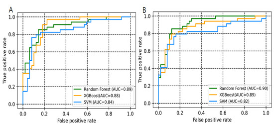 ROC curve showing the performance of binary class models. (A) All descriptor set. (B) Selected descriptors set (Boruta method).