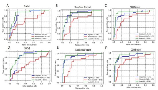 ROC curve showing the performance of multiclass models. (A–C) All descriptors set. (D–F) Selected descriptors (Boruta method).