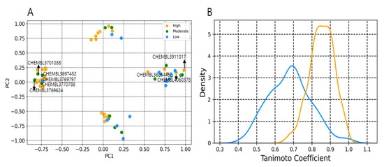 Plot showing the chemical space of falsely predicted compounds and their Tc similarities. (A) Distribution of falsely predicted compounds from test set. (B) Density plots of Tc values using MACCS fingerprints. Compared were falsely predicted low and moderate vs. high activity compounds (Orange color), and falsely predicted high activity compounds vs. low and moderate activity compounds of training set (Blue color).