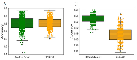 Box plot showing the frequencies of accuracies from Y-randomization models. (A) Binary class models. (B) Multi-class models. Total 500 Y-randomization runs were performed.