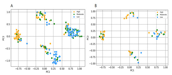 EZH2 is frequently overexpressed in several cancers, promoting cancer cell proliferation and survival. Considering the importance in cancer therapeutics, researchers from both academic and industries have focused on exploring the structural and biological function of PRC2. During the past decade a number of groups have actively continued to develop potential lead molecules for EZH2. Most of these inhibitors are known to inhibit the EZH2 enzymatic activity through a cofactor S-adenosylmethionine (SAM)-competitive mechanism rather than disruption of PRC2 complex formation. In addition, some groups have focused on designing inhibitors that can target the EED-EZH2 interface, which leads to PRC2 inactivation [27,33,34]. This study aimed to build an appropriate classification model for predicting potential hits for EZH2. We have built two types of classification models, including binary and multiclass with three different machine learning approaches. Our proposed models based on random forest and XGBoost performed well in terms of accuracy, F1 score, precision, and recall. For comparisons of classifiers, we used the area under the receiver operating characteristic curve method. A ROC curve is a graphical plot that illustrates the true positive rate against the false positive rate of classifier at different threshold settings. The AUC is then the area under this curve which represents the degree of separability and significant metrics for evaluating machine learning algorithms [35]. Higher AUC values in the ROC curves infer greater sensitivity of retrieving high activity compounds and specificity for ignoring low and moderate activity compounds (Figure 3). Based on feature importance, our study also distinguished and ranked the top eighteen variables including 2D autocorrelation, Burden modified eigenvalues, topological charge, MACCSFP105 and MACCSFP114, etc. These descriptors have capabilities to distinguish between high and low activity compounds. As shown in Figure 3, these descriptors separated the high activity and moderate or low activity compounds into different clusters. Only one low activity compound (CHEMBL3769791) was found to be in a cluster having a large number of high activity compounds. Similarly, only four high activity compounds were found to cluster with low or and moderate activity compounds (Figure 5A). The importance of these type of descriptors has also been highlighted in previous studies which focused on modelling the anti-cancer compound activity [36]. Falsely predicted compounds were found to have reasonable similarities with the true class (Figure 4B). Taken together, these results demonstrate the importance of these descriptors’ subset for predicting the activity of EZH2 compounds at lower range.