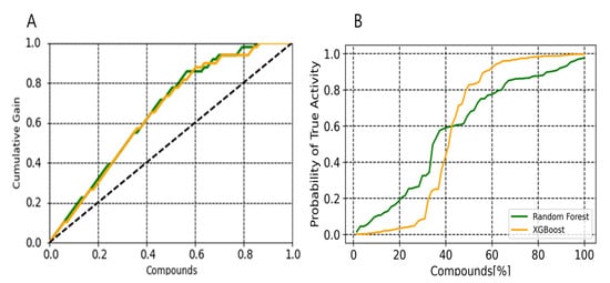 The predictiveness curve is a metric usually used in clinical epidemiology to evaluate the ability of a biological marker to assess the fit of risk models and to estimate the clinical utility of a model when applied to a population [47,48,49]. This metric can be used to assess the predictive power of a classifier as well as defining a probability threshold, the retrieving best candidates to be tested experimentally. In our study, we preferred to rationally select an optimal probability threshold rather than selecting an arbitrary fraction of the top scoring compounds. We have used PC to define a probability scoring threshold for which we can compute the probability that a molecule with this given score will be active hits. In an ideal case where all active compounds had better probability than the inactive compounds, the threshold would simply be defined as the value separating the probability values of high ranked active compound and the low ranked compound. We found that XGBoost in comparison with random forest performed better in high probability of active compounds (Figure 7). We believe that PC metrics can take into account the probability scores calculated from classifier to better understand results, which may also support the enhancement of the performances of any predictive models.