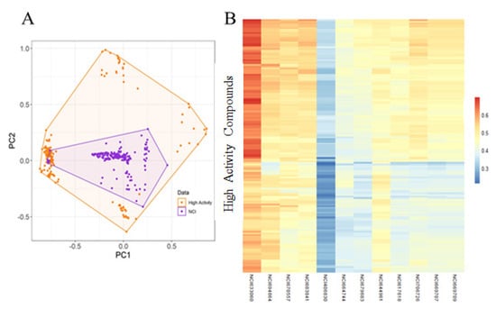 Y-randomization was used for assessing the risk of obtaining classification models by chance correlation [30]. In our case, accuracies for Y-randomization test were found to be lower, and none of the 500 random trials achieved a performance higher than our original models (Figure 5A,B). The average accuracies of all random models were found to be less than 0.58, which confirm that the selected predictive models are robust and reliable and not generated with by-chance correlations. An applicability domain (AD) experiment was performed to check the reliability of developed models. Figure 6A,B depict the scatter plot of the PC1 and PC2 coordinates derived from selected descriptors set. The result from this approach shows that the training and test compounds (except few) share similar PC1 and PC2 coordinates, suggesting that predictions were in the applicability domain (AD) of both the training and test sets. A pairwise comparison of the compounds in each cluster reflects reasonable Tanimoto coefficient similarities between them.