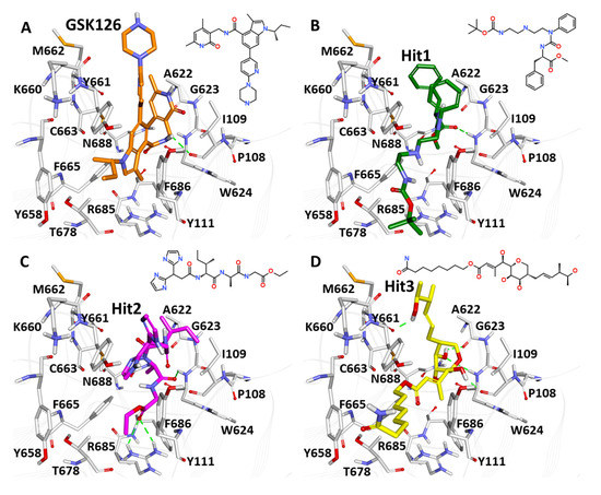 Binding analysis of top hits from molecular docking: (A) Reference compound (GSK126), (B) Hit1 (NCI694864), (C) Hit2 (NCI670557) and (D) Hit3 (NCI706726). The active site residues are shown in grey sticks. The protein backbone is shown in light grey wire. Hydrogen bonds were illustrated with green dashed line.
