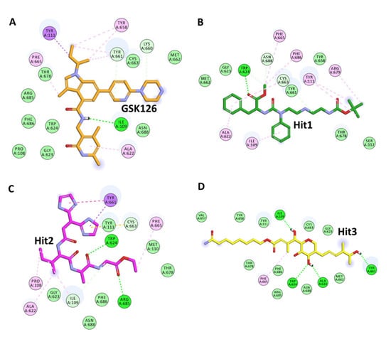 Two-dimensional schematic representations of protein–ligand interactions between GSK126 (reference compound) and the top three hits: (A) GSK126, (B) Hit1 (NCI694864), (C) Hit2 (NCI670557) and (D) Hit3(NCI706726). The hydrogen bonds, Л-Л, Л-cation, and Л-Sulphur are shown as green, pink and purple dashed lines, respectively.