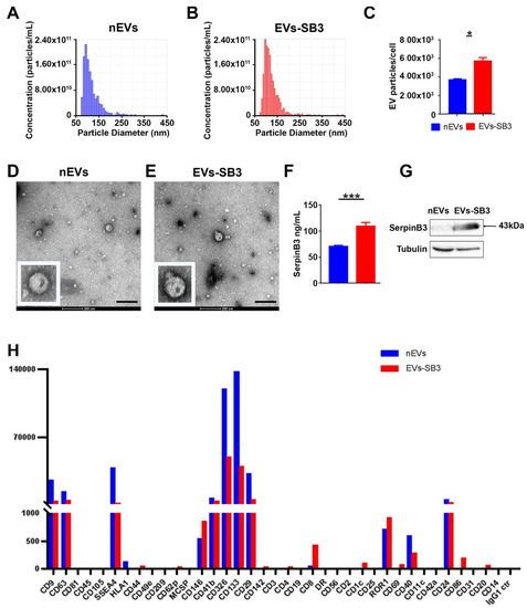 Characterization of extracellular vesicles derived from HepG2s. Representative size distribution of naïve EVs (nEVs) (A) and of EVs-SB3 (B) analysed by Resistive Pulse Sensing. (C) Number of nEVs and of EV-SB3 secreted per cell. Result are mean ± standard error (n = 5 independent experiments), * p < 0.05. Transmission electron microscopy analysis of freshly nEVs (D) and of freshly EVs-SB3 (E); scale bar refers to 200 nm. (F) SerpinB3 quantification by ELISA assay. Result are mean ± standard error (n = 5 independent experiments), *** p < 0.001. (G) Western Blot of nEVs and EVs-SB3 for SerpinB3. (H) Distribution of surface biomarker expression in nEVs and in EV-SB3.
