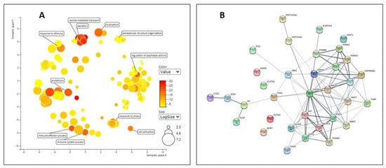 Bioinformatic analysis of proteins identified in EV preparations. (A) The enriched Gene Ontology (GO) terms that are associated to the proteins identified in EVs samples, as obtained by the gProfiler tool (p value > 0.01) and further processed with the Revigo software (n = 3 independent preparations). (B) STRING network of physical/functional interactions involving only the proteins that have a significantly different abundance in nEVs and in EVs–SB3.