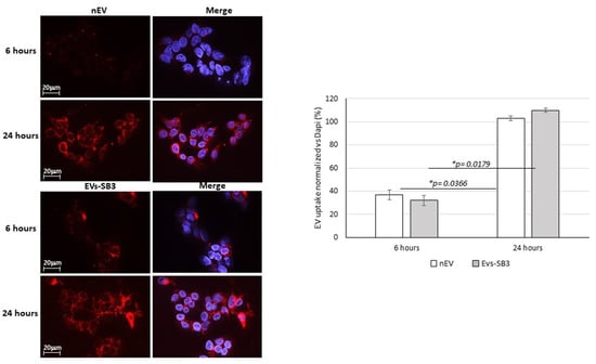 In order to verify whether the EVs produced were internalized by the cells, EVs were labeled with a Vybrant™ DiI Cell-Labeling Solution. The signal of red fluorescence was detectable as early as 6 h after treatment and significantly increased at 24 h. These results indicate an efficient internalization of both extracellular vesicles within target cells. No quantitative differences were observed between the uptake of nEVs compared to EVs-SB3 (Figure 4).