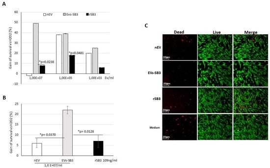 The second step aimed to identify the concentration range of EVs able to induce a protective effect in the in vitro model of oxidative damage. A wide concentration range was tested, ranging from 109 to 10−1 EVs/mL and a dose-dependent protective effect was observed. The optimal EV-SB3 concentration to achieve a protective effect in vitro was equal to 107 EVs/mL. This positive result was higher than that determined by recombinant SB3 alone, used at the same SB3 concentration (109 ng/mL) detected by ELISA in the EVs-SB3 preparation used in this experiment (Figure 5A).