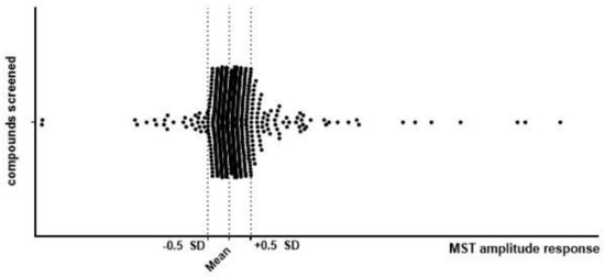 The MicroScale Thermophoresis (MST) technique was chosen to identify molecules able to interact with the extracellular domain of the TrkB receptor (exTrkB). In the first screening phase, 987 compounds were tested for binding to the labeled exTrkB receptor and the MST signal was recorded (Figure 1). The acquired results were in the range of −9.6 to 46.6. One hundred and eighty-one compounds with amplitudes greater than 0.5 standard deviations (SDs) were selected for further analysis.