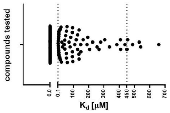 Binding affinity values (Kd) determined using the MST technique. Threshold (dotted lines) for compound selection was set from 0.1 to 450 μM. Fifty-nine molecules from the pool of 113 tested compounds presented Kd values in the range 0.1–450 μM. Non-binding compounds are indicated on the graph as Kd = 0 μM.