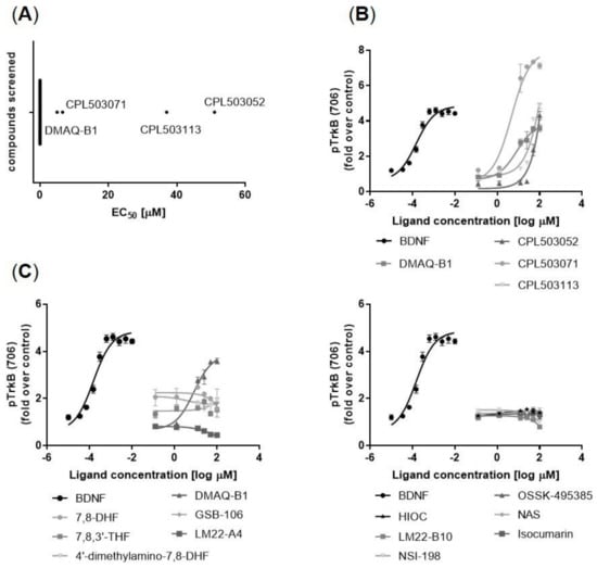 Subsequently, 59 compounds selected in the primary screening were tested functionally to evaluate their ability to induce TrkB receptor phosphorylation (Tyr706) in vitro (Figure 3A). BDNF induces TrkB phosphorylation with a half maximal effective concentration (EC50) = 3.7 nM (Figure 3B). The following compounds were identified as TrkB orthosteric activators (Figure 3B): DMAQ-B1 (EC50 = 5.6 μM), CPL503052 (EC50 = 2.6 μM), CPL503071 (EC50 = 6.6 μM), and CPL503113 (EC50 = 44.2 μM). However, remaining compounds postulated to act as TrkB agonists, including 7,8-DHF, failed to show any activity in this assay and did not induce TrkB phosphorylation in vitro (Figure 3C). Due to the lack of orthosteric activity observed for reference compounds, the ability to induce TrkB phosphorylation was analyzed in a positive allosteric mode (PAM) experiment. All of the tested molecules were not able to positively modulate BDNF’s activity on TrkB (Figure S1).