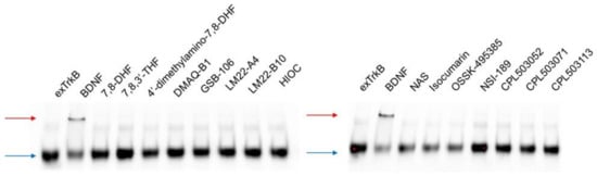 Moreover, native electrophoresis was performed to evaluate the dimerization-inducing properties of selected compounds. As shown in Figure 4, BDNF was able to induce exTrkB dimerization. No effect on ligand-provoked exTrkB dimerization was observed for low-molecular-weight compounds.