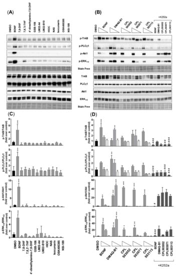 The effect on the phosphorylation of downstream proteins (the phosphorylation of PLCγ1 on Tyr783, phosphorylation of Akt1 on Ser473, and phosphorylation of ERK1/2 on Thr202/Tyr204) was evaluated in SN56 T48 cells using an immunoblotting technique. Cells treated with BDNF demonstrated significantly increased phosphorylation of PLCγ1, Akt1, and ERK1/2, with simultaneous induction of TrkB phosphorylation in a dose-dependent manner (Figure 5A–D). Western blot analysis confirmed the lack of TrkB phosphorylation for 7,8-DHF, which was previously assessed by the ELFI method (Figure 3), where concentrations of 100 μM did not induce the phosphorylation of TrkB and downstream proteins (Figure 5A,C). The lack of effect was observed for all the reference compounds except DMAQ-B1 (Figure 5A,C). Cells treated with CPL503052, CPL503071, and CPL503113, active compounds identified in the screening phase, demonstrated the activation of the TrkB receptor and phosphorylation of relevant downstream proteins (Figure 5B,D). However, the inhibition of TrkB kinase by K252a in the case of these compounds did not repress the activation of downstream proteins (Akt1 and ERK1/2), which was observed for BDNF (Figure 5B,D).