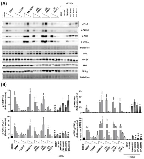 Due to the lack of activity for 7,8-DHF and other reported low-molecular-weight TrkB receptor agonists in SN56 T48 cells, we subsequently evaluated the activity of these compounds using a differentiated SH-SY5Y model. The SH-SY5Y cell line differentiated by retinoic acid (RA) is a widely used neuron-like model in neurobiological research [27]. Moreover, retinoic acid treatment induces TrkB overexpression, as confirmed by our Western blot analysis (Figure S2). As expected, treatment with BDNF induced the TrkB receptor and phosphorylation of downstream proteins (PLCγ1 Tyr783, Akt1 Ser473, and ERK1/2 Thr202/Tyr204) (Figure 6A,B). The treatment of cells with 7,8-DHF did not result in the expected effect on TrkB phosphorylation and downstream protein activation. Treatment with DMAQ-B1 and CPL503052, CPL503071, and CPL503113 in the differentiated SH-SY5Y model in which TrkB overexpression was induced by retinoic acid confirmed our previous findings observed in SN56 T48 cells. These compounds were able to induce the phosphorylation of TrkB, Akt1, ERK1/2, and PLCγ1. However, pretreatment with K252a did not significantly inhibit the phosphorylation of the TrkB receptor (except BDNF), whereas decreased phosphorylation of PLCγ1 and ERK1/2 proteins could be observed for BDNF and the low-molecular-weight compounds. The decrease in the Akt1 phosphorylation level after K252a treatment could be observed only for BDNF-treated cells. Moreover, DMAQ-B1 and molecules from the compound library were able to significantly induce the phosphorylation of ERK1/2 and Akt1 protein in non-differentiated SH-SH5Y cells (Figure S3).