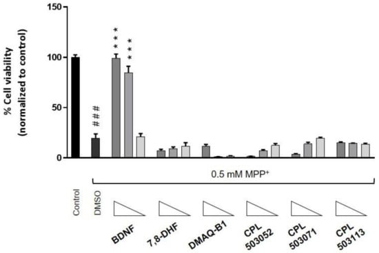 The cytoprotective effect of BDNF has been demonstrated in many in vitro and in vivo models [28]. Using the neuron-like model, we investigated the cytoprotective effect of reference compounds and molecules selected in previous phases in MPP+-induced cytotoxicity. The MPP+ was used as an apoptosis inducer in RA-differentiated SH-SY5Y. As shown in Figure 7, BDNF had a dose-dependent cytoprotective effect, which manifested in increased cell viability compared to cells treated with MPP+ only. 7,8-DHF, at concentrations of 0.3, 1, and 3 μM, was not able to protect differentiated SH-SY5Y cells against MPP+-induced toxicity. Moreover, DMAQ-B1, CPL503051, CPL503071, and CPL503113 did not demonstrate any cytoprotective effect. The remaining reference compounds also did not show any influence on cell viability in this model (Figure S4).