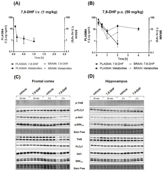 The pharmacokinetic curves for 7,8-DHF in the plasma and the brain after single intravenous (i.v.) (1 mg/kg) and oral (p.o.) (50 mg/kg) administration are presented in Figure 8A,B, respectively. After i.v. injection, 7,8-DHF was not detectable in either plasma or brain samples, suggesting very rapid elimination. After oral administration, 7,8-DHF showed a maximal concentration of 77.43 ng/mL at the first plasma collection time point (10 min post-administration). The concentration decreased in a rapid manner, falling under the detection limit at 1 h post-administration. In the brain, 7,8-DHF was detected at a very low concentration (Cmax = 6.35 ng/g) after p.o. administration. The calculated PK parameters are presented in Table 3, and detailed results of the analyte concentrations of individual mice are presented in Table S2. Moreover, the concentrations of two major metabolites of 7,8-DHF—7-hydroxy-8-methoxyflavone (7H8M-flavone) and 8-hydroxy-7-methoxyflavone (8H7M-flavone)—were also analyzed [29]. Figure 8A,B presents the concentration determined for the total amount of these two analytes due to bioanalytical limitations related to their identical molecular weights. 7,8-DHF metabolites were detected only in the plasma and peaked 10 min after oral administration and 5 min after i.v. administration, suggesting the rapid transformation of 7,8-DHF and confirming its fast elimination. Furthermore, the impact of 7,8-DHF administration on the activation of TrkB and its dependent pathways in vivo was evaluated by immunoblotting in homogenates from the hippocampus and frontal cortex collected 30 min and 2 h after oral administration. As shown in Figure 8C,D, we did not observe any activation of the TrkB receptor, as measured by receptor phosphorylation (Tyr707) in the analyzed samples. Furthermore, densitometric analysis also indicated no impact of compound administration and metabolites on PLCγ1, Akt1, and ERK1/2 phosphorylation (Figure S5).