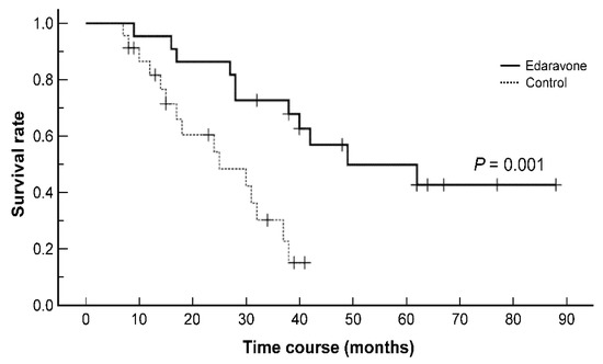 Kaplan–Meier survival curves of patients with amyotrophic lateral sclerosis showing a significant difference in the survival rate between the edaravone and control groups (p = 0.001, log-rank test).