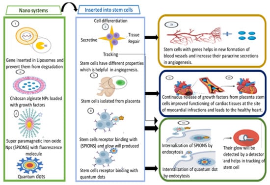 Cardiovascular diseases cause millions of deaths around the world [18]. Various treatments have improved the survival rate of patients with heart diseases but none of them has achieved complete cardiac regeneration, especially for patients after cardiac infarction [107]. Stem cell therapy can be used for therapeutic angiogenesis [108]. Introducing anti-apoptotic and pro-angiogenic genes into the genetically engineered stem cells can prolong their rate of survival and increase their paracrine secretion [109,110]. Viral vectors cannot be used to deliver genes to stem cells as they cannot carry large gene volumes and have immunogenic effects. Bio-compatible NPs are efficient in transferring genes to stem cells. Various nanostructures can be used for delivering genes to stem cells. Liposomes are one of the best contenders for gene delivery as they can prevent the non-specific binding of genes and protect them from degradation [111,112]. Polymers show improved specificity for targets and higher efficiency [113]. In one study, chitosan alginate NPs were used to deliver growth factors to placental cells. The continuous release of growth factors improved the functioning of cardiac tissues at the site of myocardial infarction [114]. NPs also have the potential for tracking and monitoring stem cells. Superparamagnetic iron oxide nanosystems (SPIONs) are made to enter the cells by attaching to cell surfaces. These cells are then internalized by endocytosis [115]. Quantum dots can also be used for monitoring the living cells for a long time [116,117].