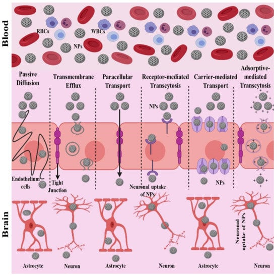 NPs, when conjugated with ligands, show the best performance by interacting with BBB receptors at low density. NPs can adopt multiple pathways in order to cross the BBB [127]. The proposed pathways which NPs can use to cross the BBB are shown in Figure 3. The main pathways include