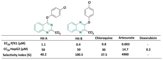 Focusing on the development of new anti-infective agents, our team has reported the antiplasmodial activities of nitrogenous heterocyclic scaffolds bearing a trichloromethyl (CCl3) group, including a hit molecule (A) in quinazoline series (Figure 1) [6,7,8]. This hit-compound showed a good antiplasmodial profile (EC50 PfK1 = 1.1 µM and CC50 = 50 µM) [9]. Furthermore, replacement of the quinazoline ring by a quinoxaline one (hit B, Figure 1), using a scaffold-hopping strategy, improved the antiplasmodial activity and preserved the cytotoxicity profile compared to hit A.